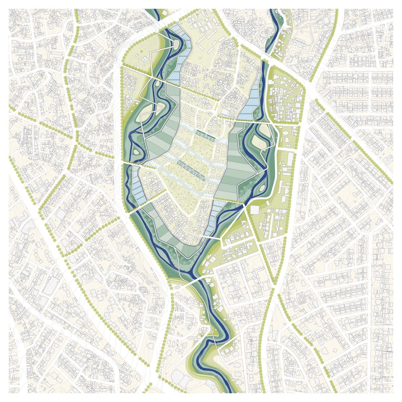 This academic research aims to design a holistic urban resilience and regenerative strategy for Addis Ababa, whose main elements are the more than 50km of river tributaries that weave the city. For that, the project proposes a new "ecological infrastructure" that uses the rivers as the main element to tackle the city's most urgent challenges and, given the city's morphology, to reach most parts of the population.